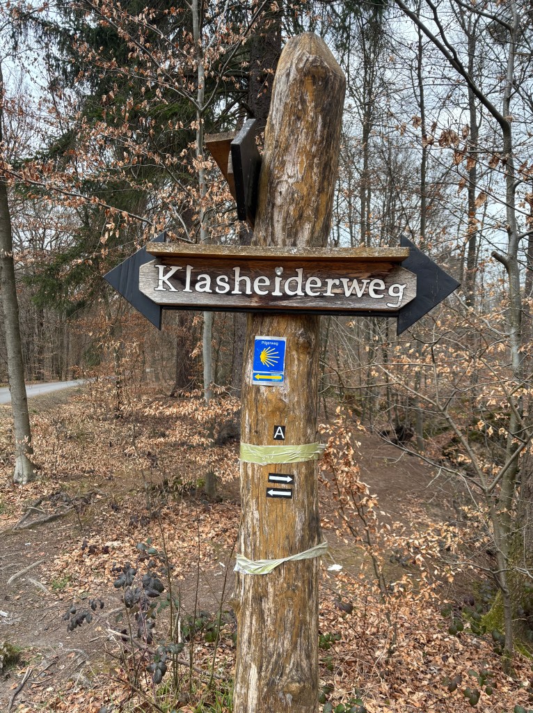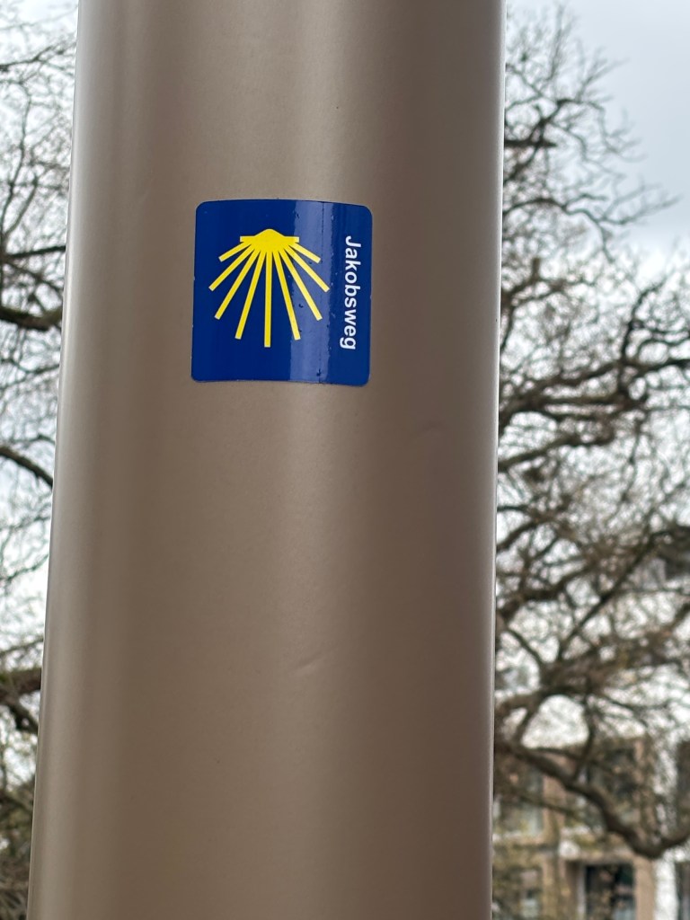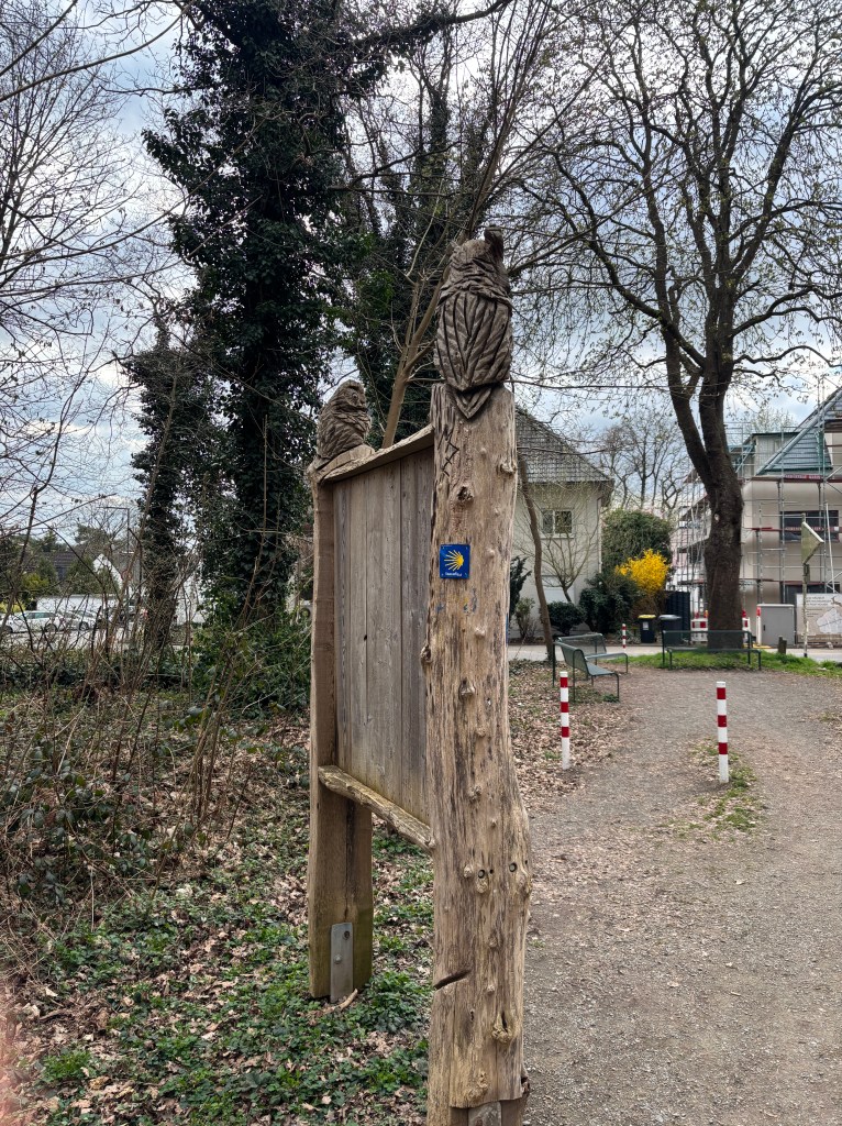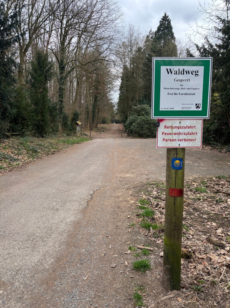 Weiter führt uns die Jakobsmuschel als Wegweiser durch die Innenstadt rechts zur Friedrich Offermann Straße. Von dort gehen wir in die Broicher Straße, wo wir an der Abzweigung Broichen links in den Königsforst hineinwandern. An der Infotafel folgen wir der Muschel nach rechts auf die Brüderstraße. Dort sehen wir nach ein paar Schritten rechts einen Sühnestein von 1636 (weitere Infos s. Abschnitt „Sehenswertes“ auf dieser Etappe.)