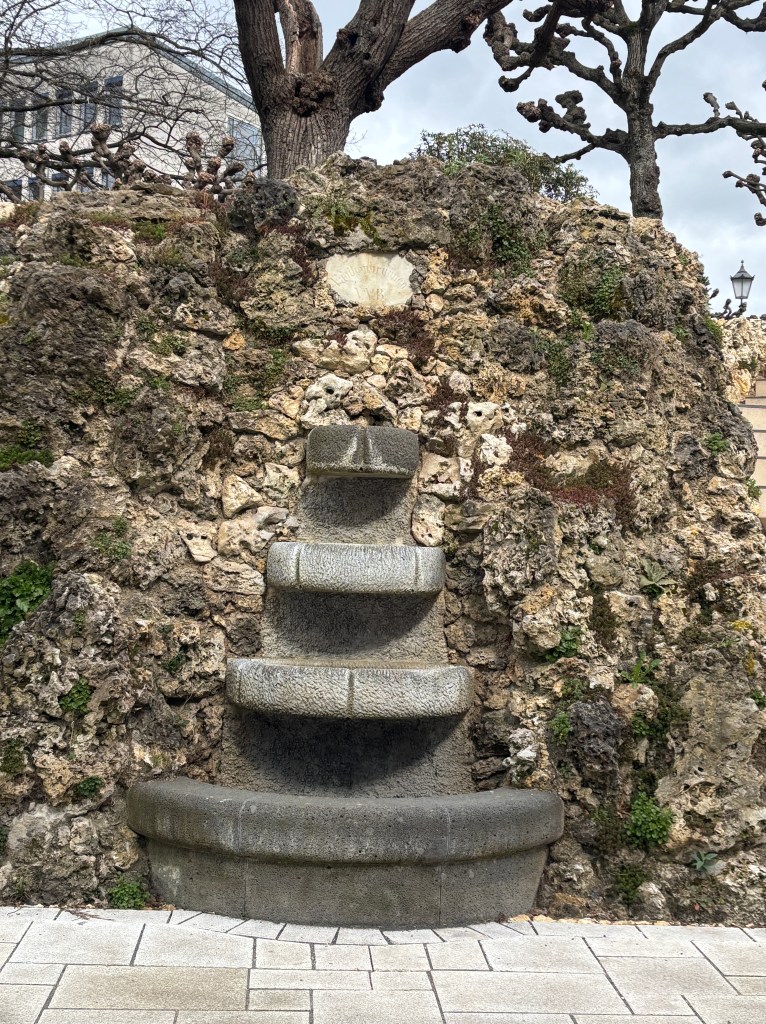 Auf der linken Seite sehen wir direkt zu Beginn den Emilienbrunnen. Dieser ist der Frau Emilie Schmitz gewidmet. Sie hat als Protestantin mit großzügigen Spenden die Fertigstellung und Ausstattung der Pfarrkirche St. Nikolaus in Bensberg unterstützt.