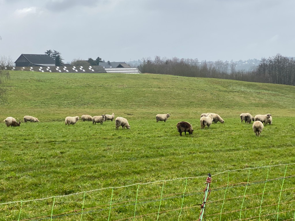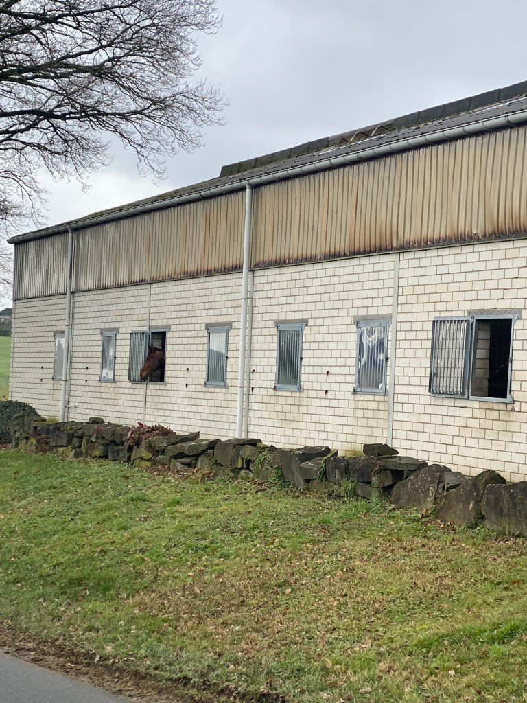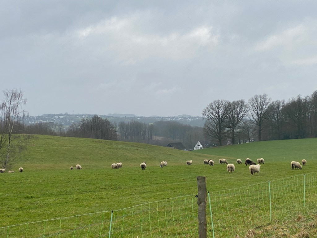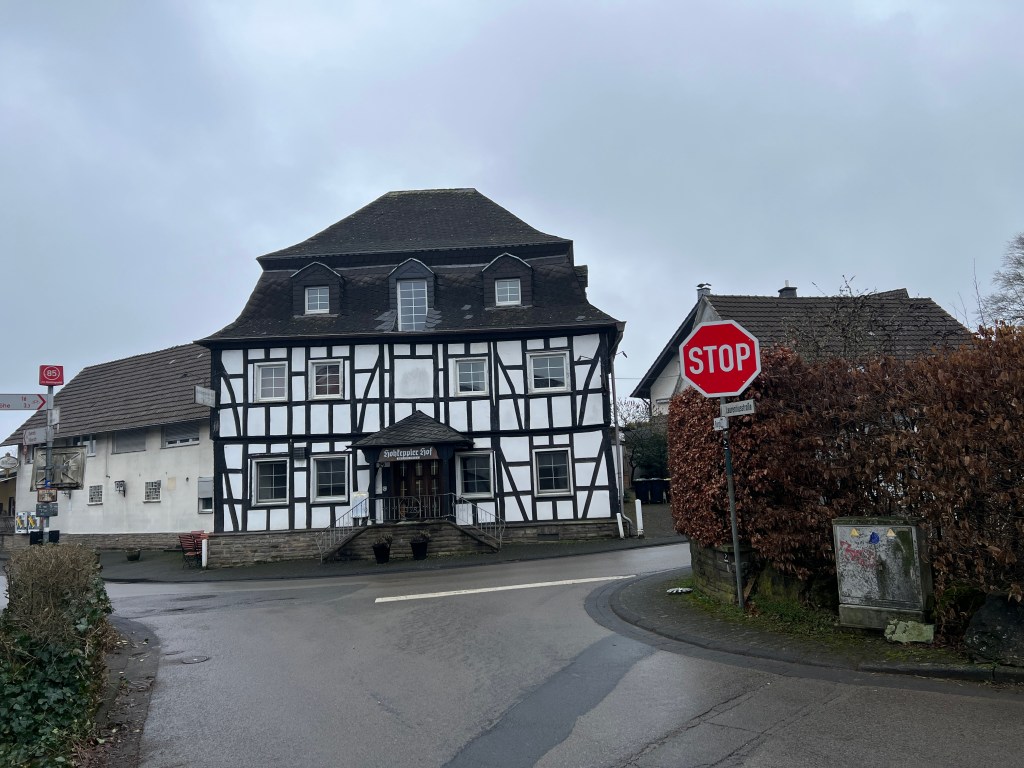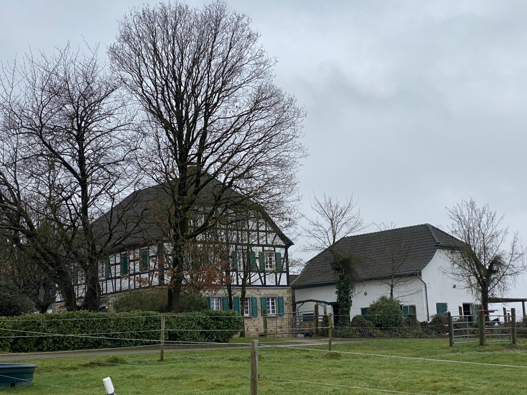 Der Jakobsweg verläuft über die Landstraße, vorbei am Lehnhof Herrenhöhe mit seiner typisch bergischen Architektur aus Grauwackesockel und darauf errichteten prächtigen Fachwerk: wahrlich eine Augenweide.