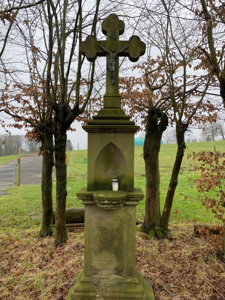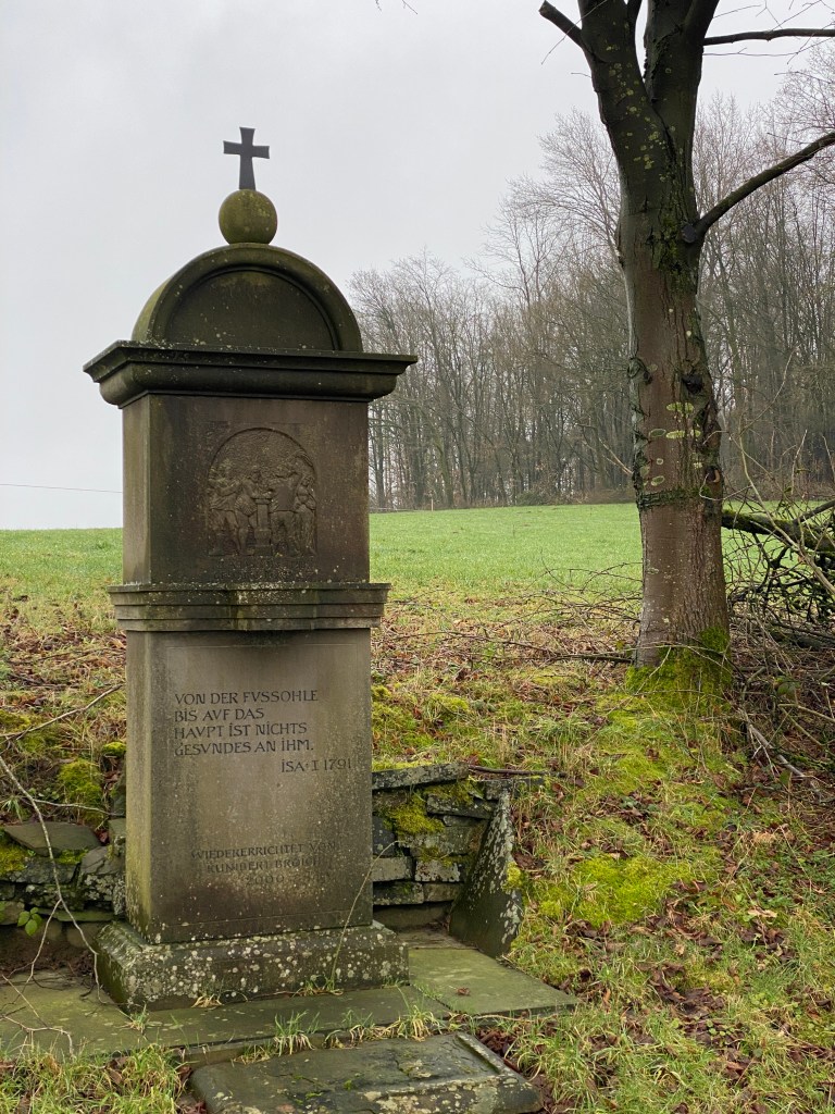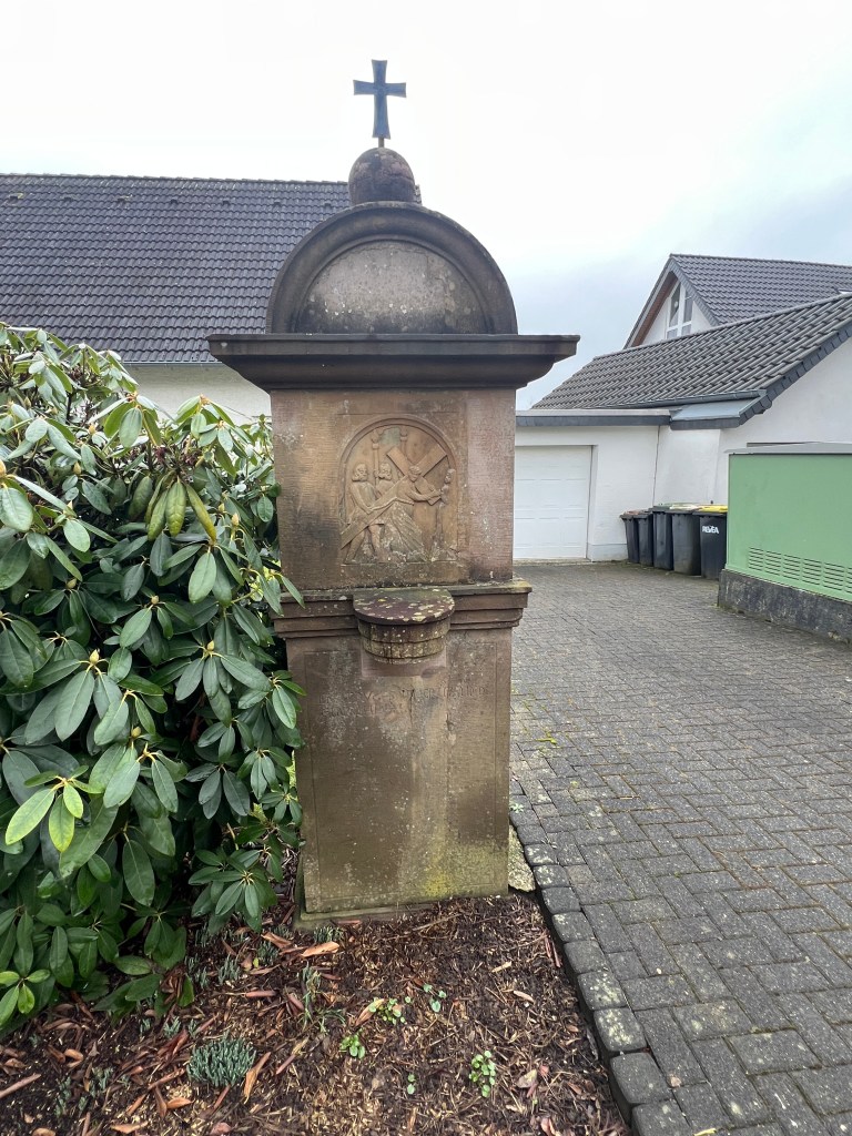 Am Hohkeppler Ensemble aus der über 1000 Jahre alten Kirche St. Laurentius und dem Weissen Pferdchen -beide direkt am Jakobusweg gelegen- starten wir unseren Pilgergang. Der führt zunächst am denkmalgeschützten Kreuzweg vorbei, der zu etwa der Hälfte in Hohkeppel selbst und zur anderen ausserhalb des historischen Ortes liegt.