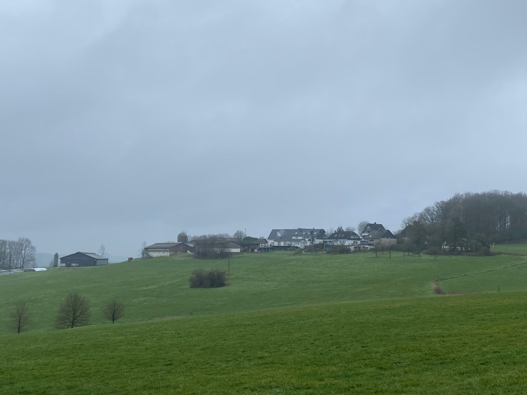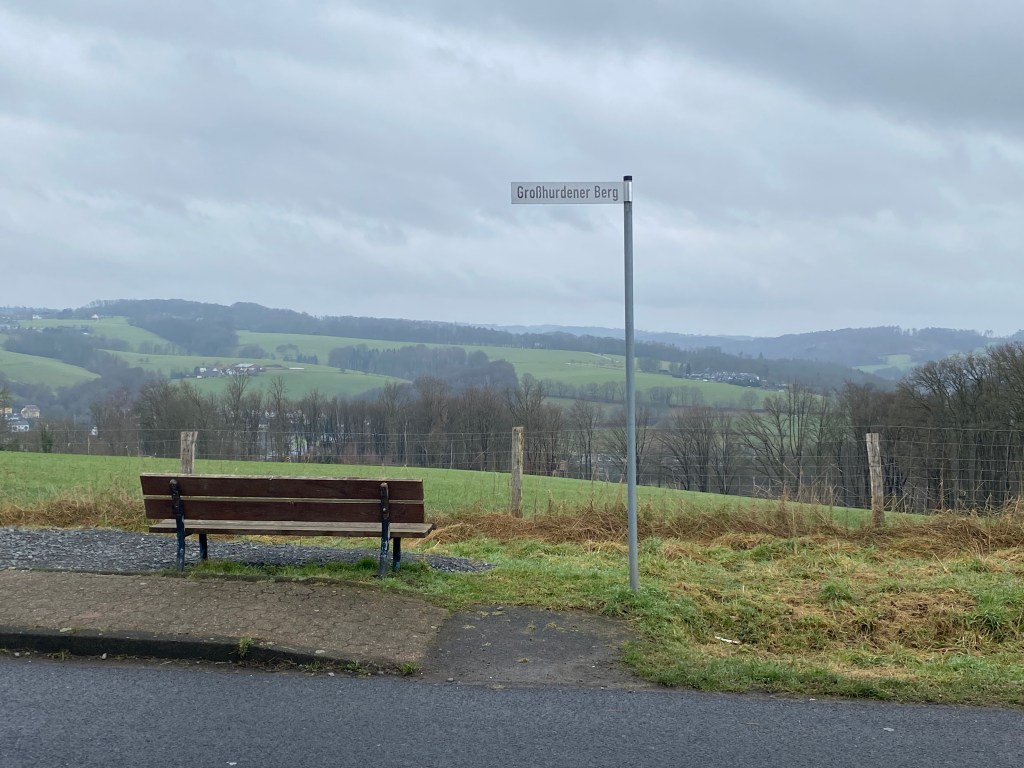 In Hufe erreichen wir kurz hinter dem Hof den höchsten Punkt der Etappe mit 270 Höhenmetern. Von dort eröffnet sich bei gutem Wetter ein grandioser Blick auf Marialinden, den Rhein Sieg Kreis und das fern gelegene Siebengebirge, bis hin zur Eifel im Südwesten gelegen.