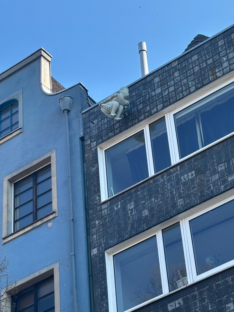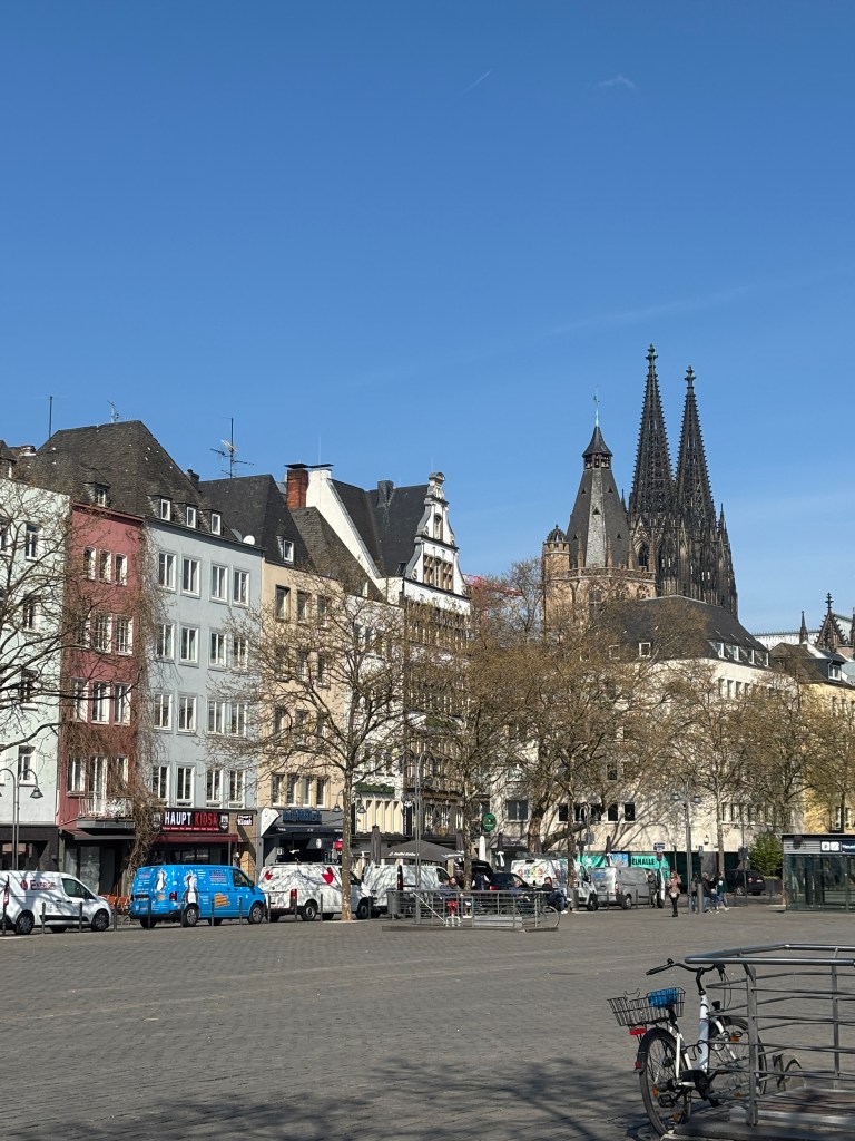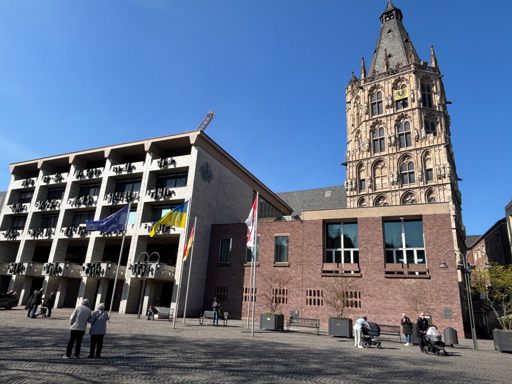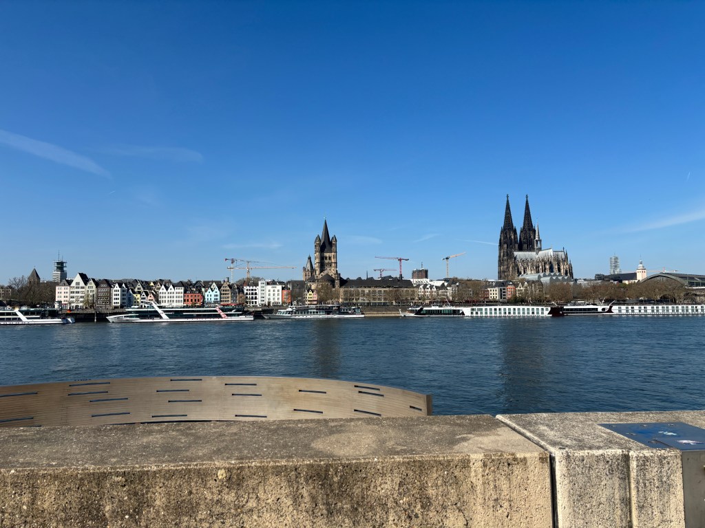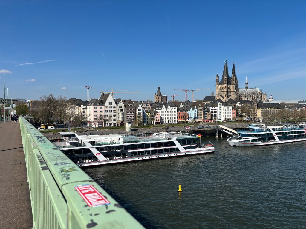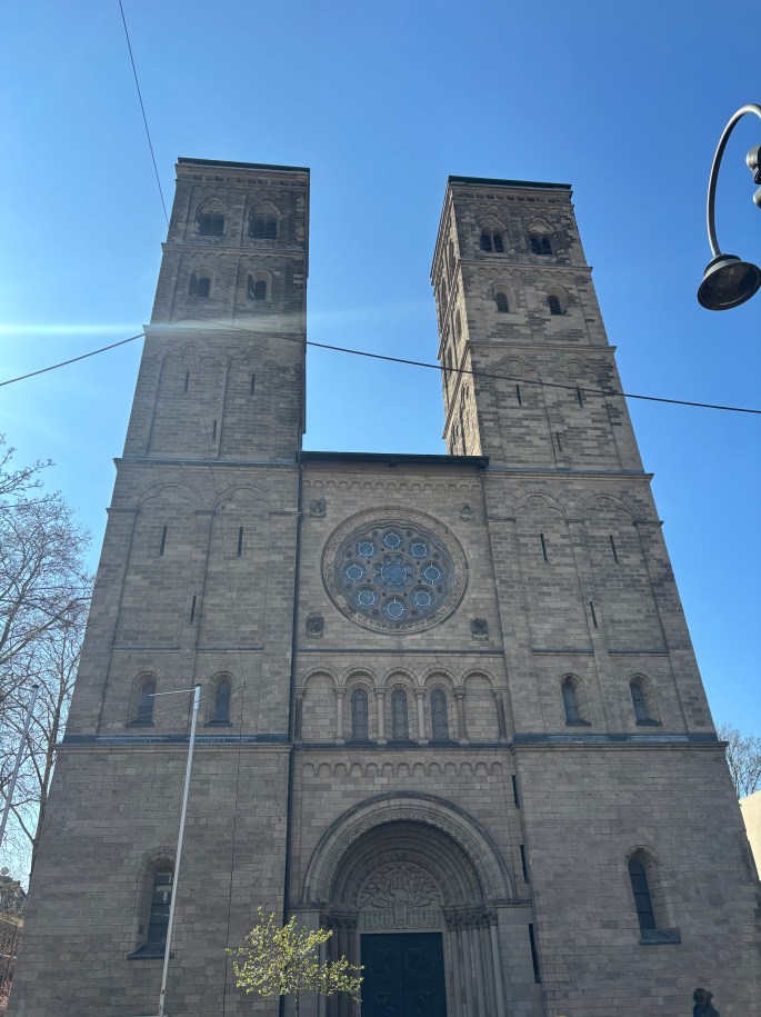 Wir gehen weiter zur „Deutzer Freiheit“. Nette Cafes und Restaurants laden zum Verweilen ein. Am Ende der Straße sehen wir dann den imposanten Bau der Deutzer Kirche St. Heribert (neu).