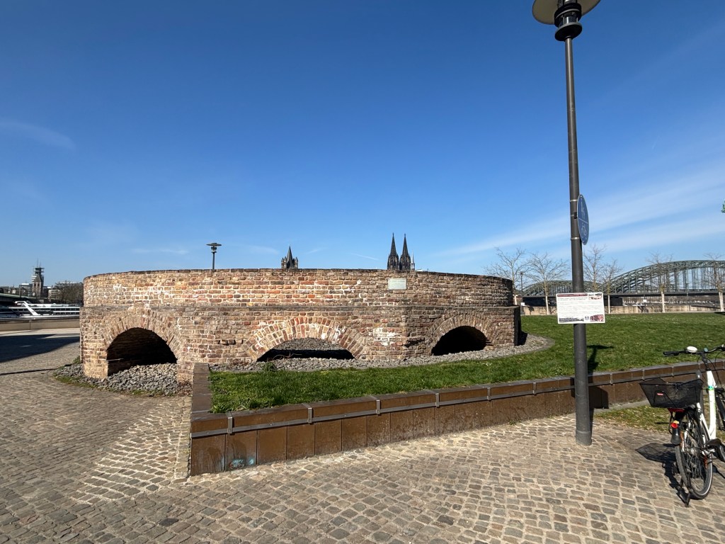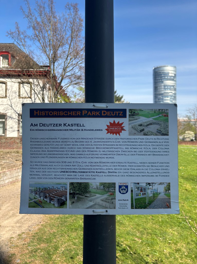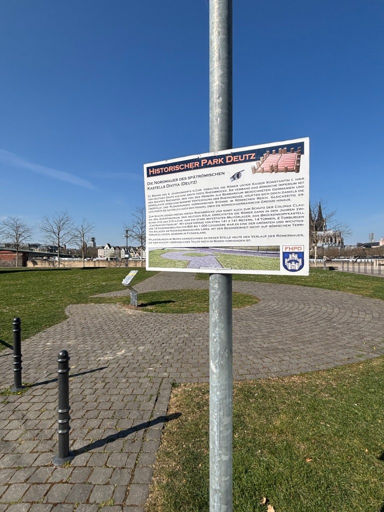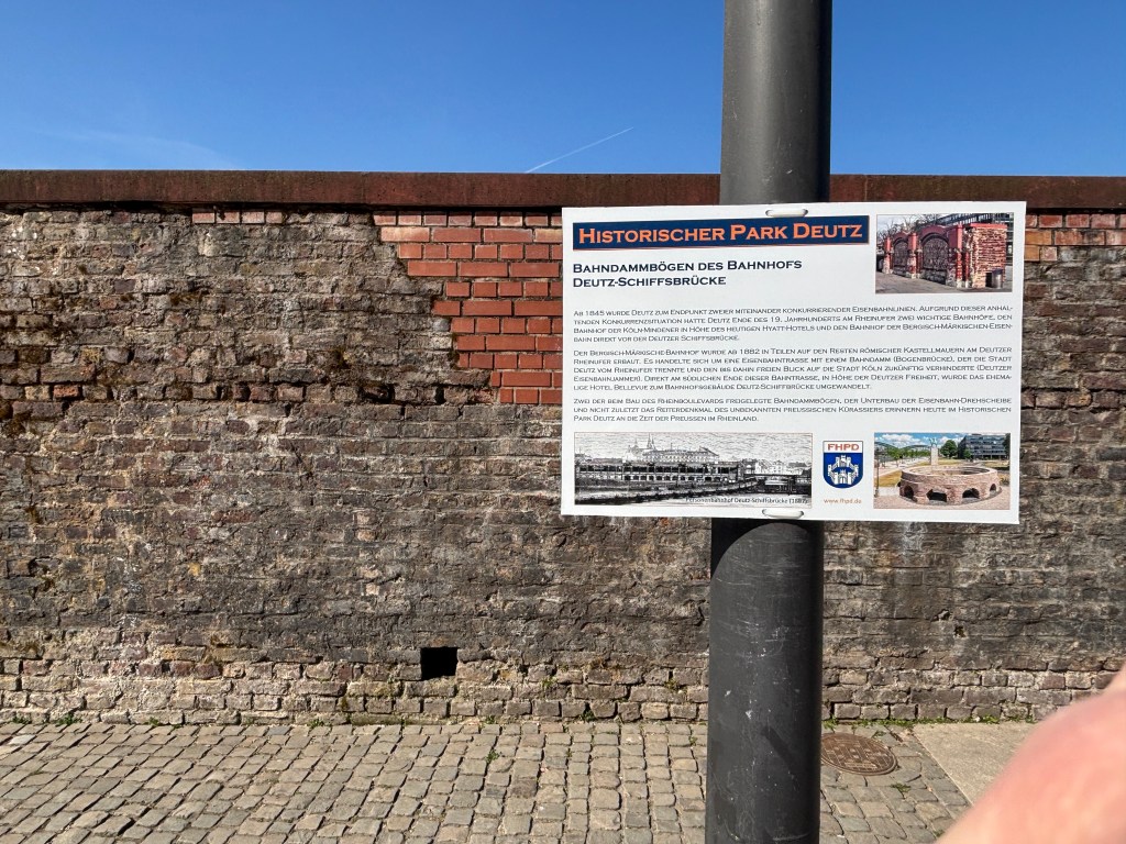 Wir gehen durch die Unterführung der Straßenbahnhaltestelle direkt in den historischen Park am Deutzer Rheinufer mit dem Kastell Divitia Deutz (römisch germanischer Militär- und Handelsweg). Zu entdecken gibt es ebenfalls den Unterbau einer Eisenbahn-Drehscheibe des Bahnhofs Deutz – Schiffsbrücke, die Nordmauer des spätrömischen Kastells Divitia Köln Deutz, Bahndammbögen des Bahnhofs Deutz-Schiffsbrücke.