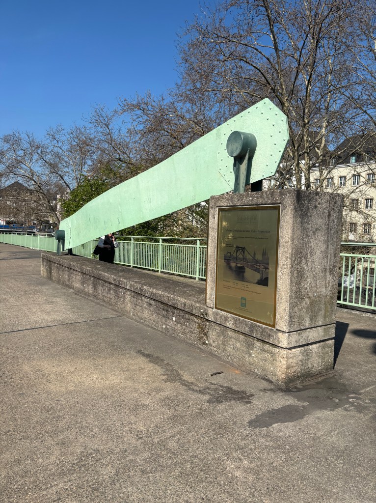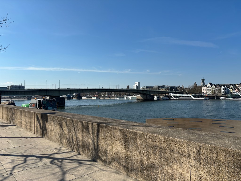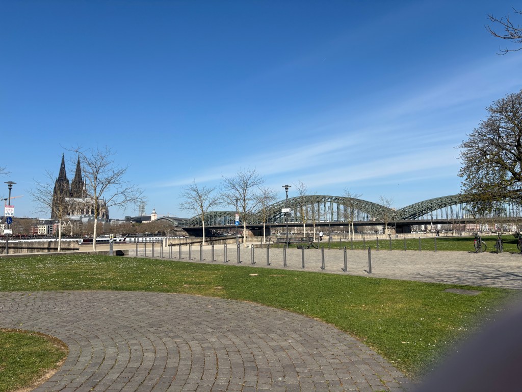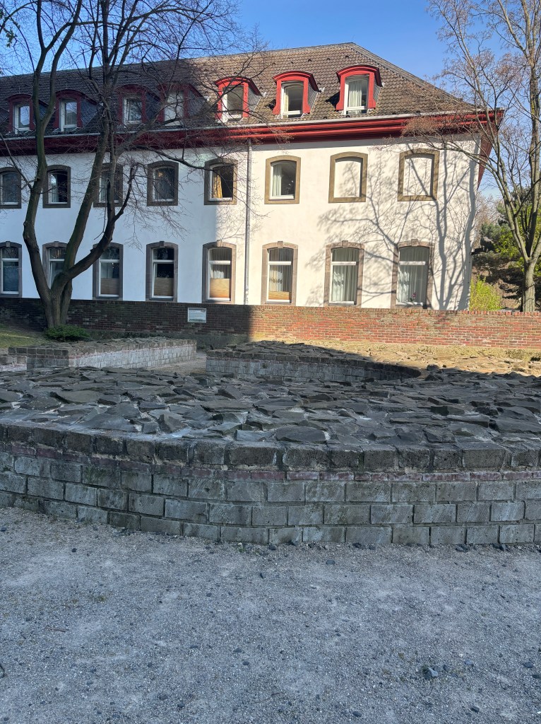 Wir gehen durch die Unterführung der Straßenbahnhaltestelle direkt in den historischen Park am Deutzer Rheinufer mit dem Kastell Divitia Deutz (römisch germanischer Militär- und Handelsweg). Zu entdecken gibt es ebenfalls den Unterbau einer Eisenbahn-Drehscheibe des Bahnhofs Deutz – Schiffsbrücke, die Nordmauer des spätrömischen Kastells Divitia Köln Deutz, Bahndammbögen des Bahnhofs Deutz-Schiffsbrücke.