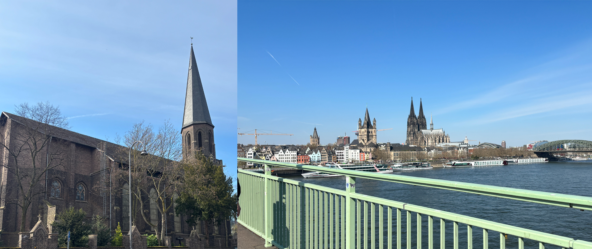 Wir gehen weiter zur „Deutzer Freiheit“. Nette Cafes und Restaurants laden zum Verweilen ein. Am Ende der Straße sehen wir dann den imposanten Bau der Deutzer Kirche St. Heribert (neu).